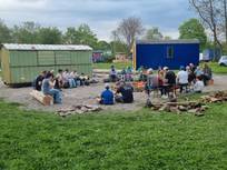Bereits am 18. April wurde kräftig angepackt: Rund 40 Helferinnen – Pfadfinderinnen aus allen Altersgruppen sowie ihre Familien – waren den ganzen Tag im Einsatz, um ihren neuen Platz zu gestalten. Mit viel Engagement und Eigeninitiative entstand eine große Feuerstelle, zwei Bauwagen wurden abgeschliffen, grundiert und neu gestrichen, und ein stabiles Holzlager wurde gebaut.
